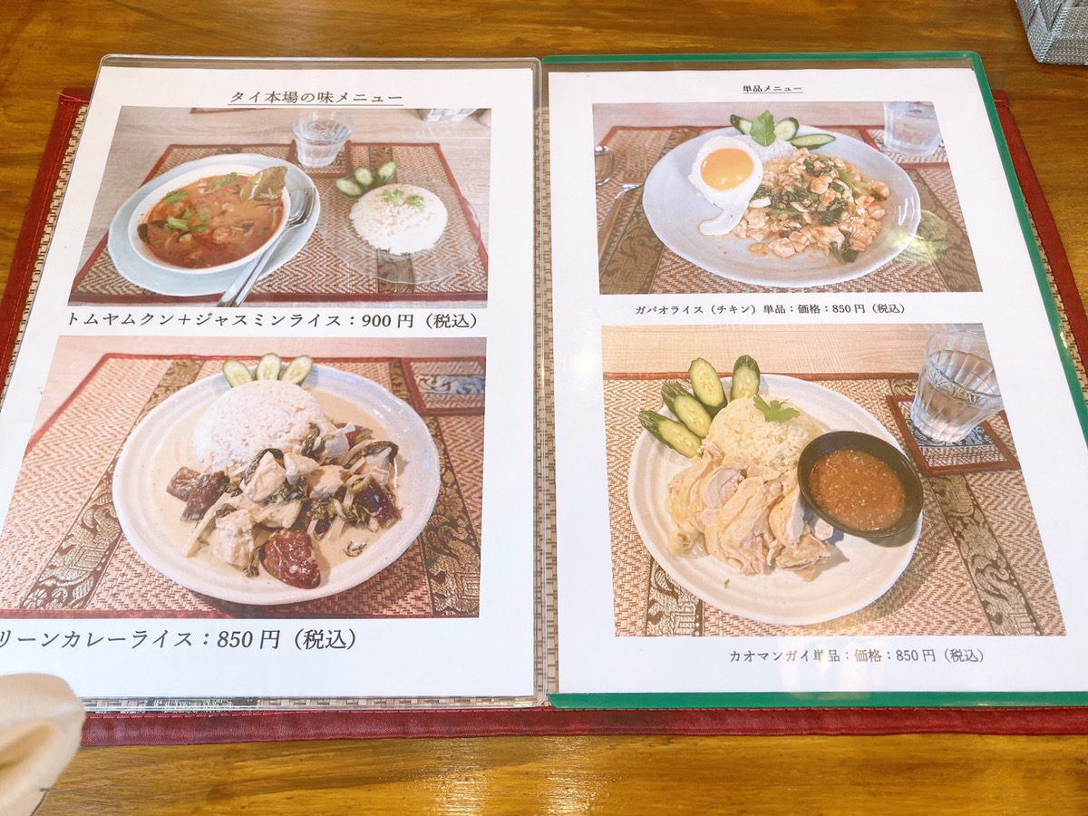 メニューはこんな感じ。写真が大きくてとても親切ですね。ガパオライスにグリーンカレーライス、タイ料理の定番であり人気メニューを押さえてあります。