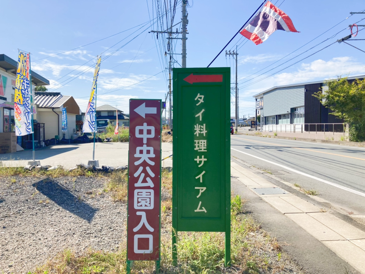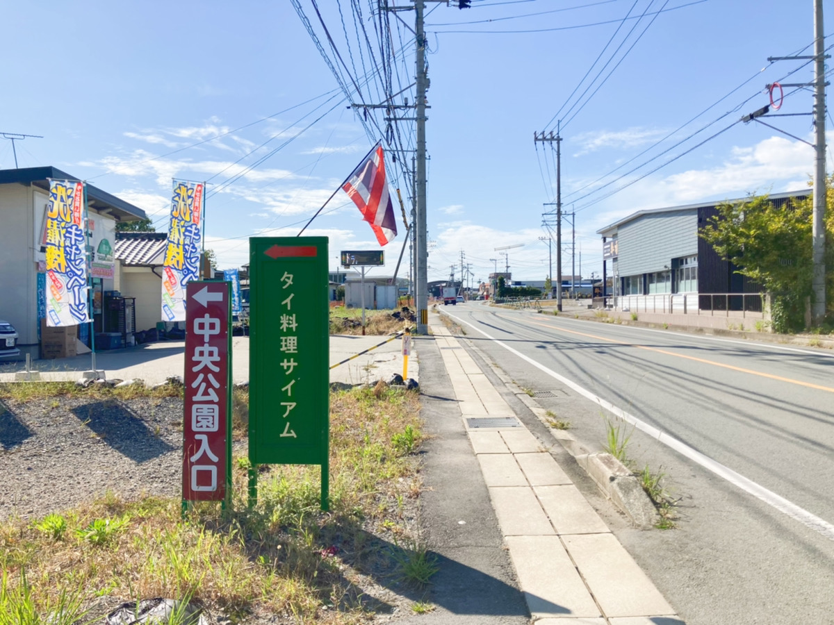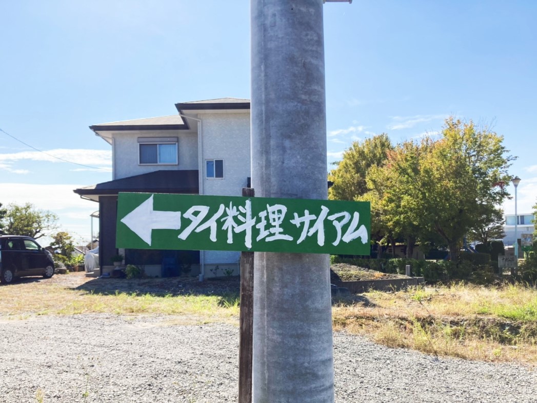 「タイ料理サイアム」と掛かれた緑色の看板、そしてタイの国旗。まずはこれを見つけましょう。