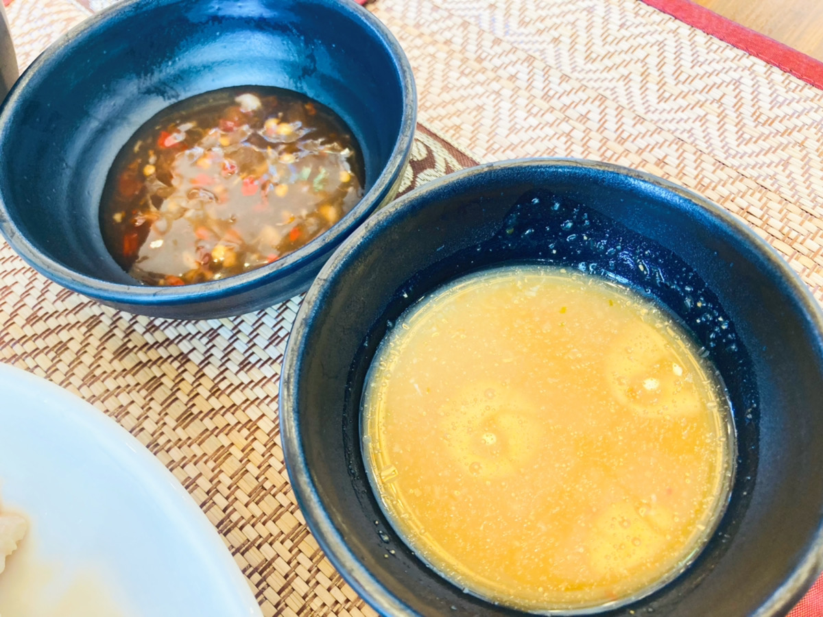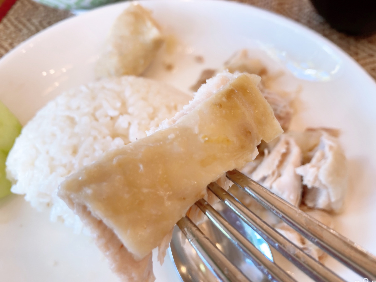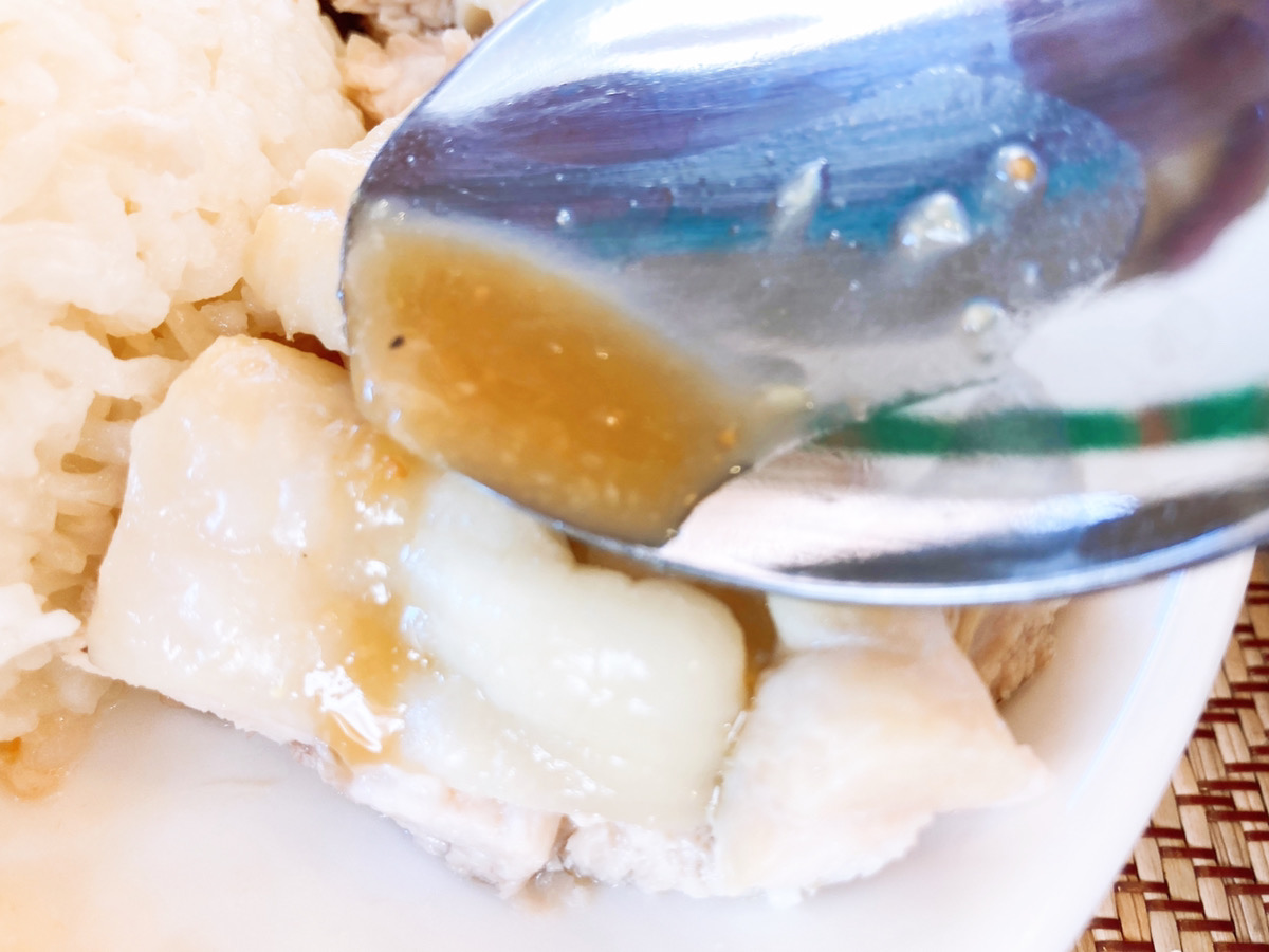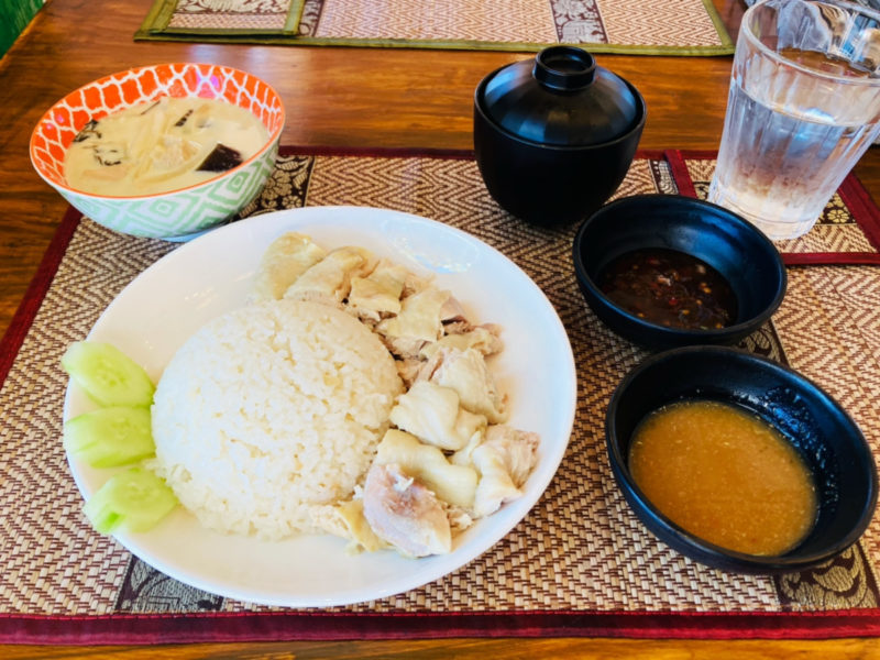 カオマンガイから頂きます。カオマンガイは蒸した鶏肉と、鶏肉のスープで炊き込んだご飯を一緒に食べる料理です。