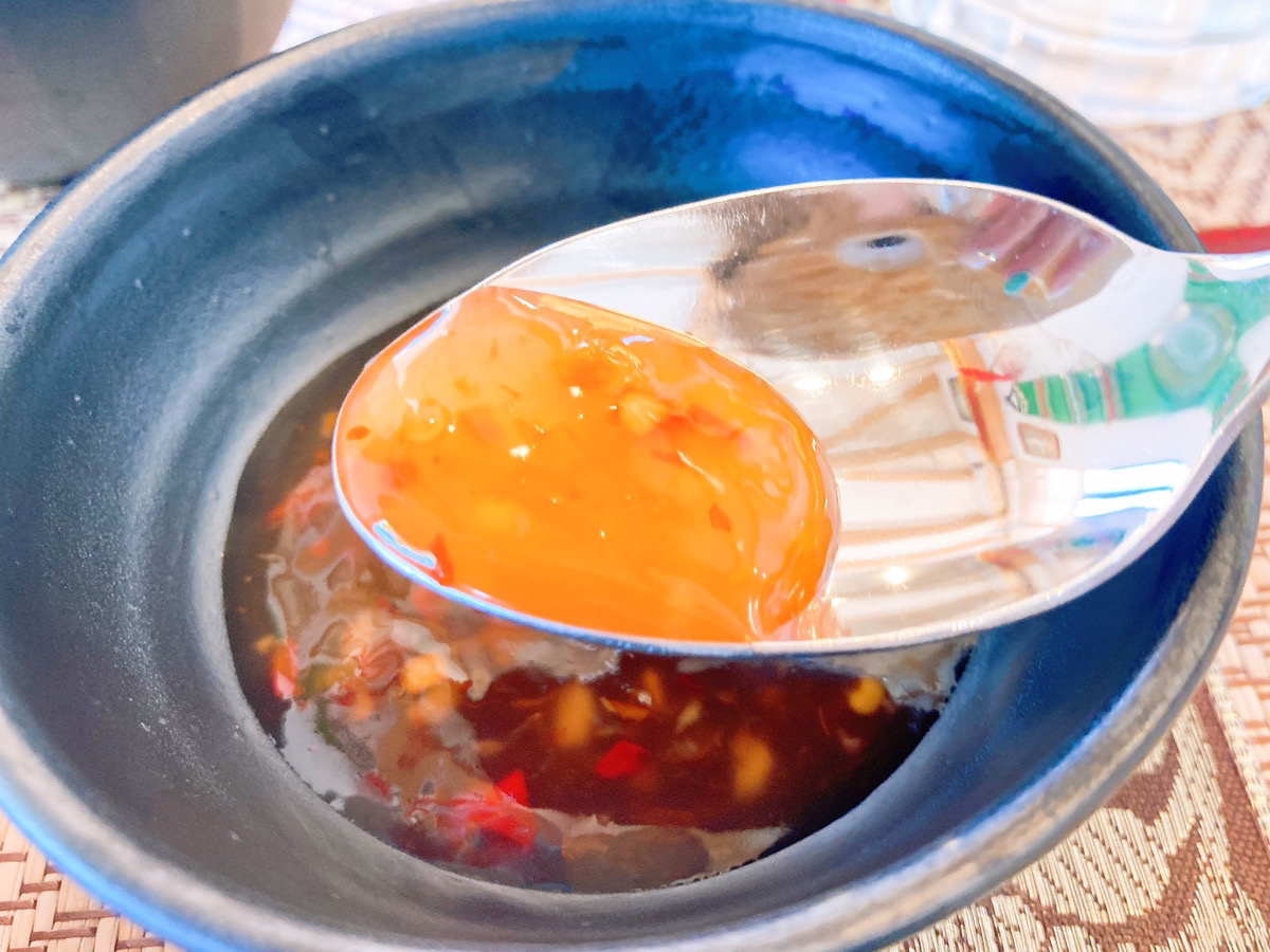 スイートチリソースは甘い口当たりの中にピリッとする辛さが特徴的。タイ料理の定番ソースですね。