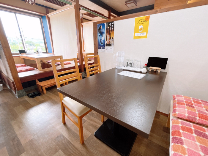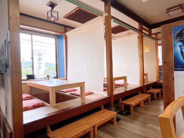 テーブル席に加えて、掘りごたつの半個室席もあります。仕切りはロール式なので、仕切りを外すと大人数でも利用できるのがいいですね。