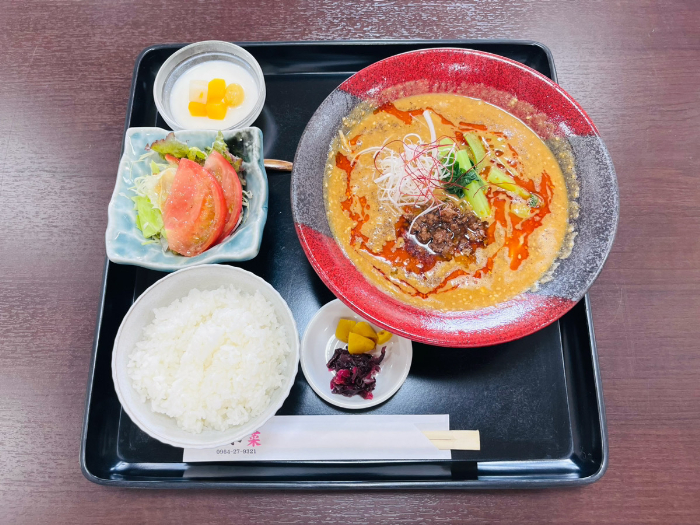 今回は担々麺の麺セットを頂きました。メインの担々麺にサラダ、ご飯、デザート、ソフトドリンクが付きます。