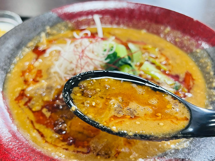 レンゲですくうと、しっかりどろどろのスープ!味噌の味が強く、コクがあります。そして、ラー油がぴりっとした辛さをプラス。