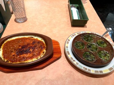 左が「ミラノ風ドリア」。右が「エスカルゴのオーブン焼き」です。