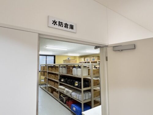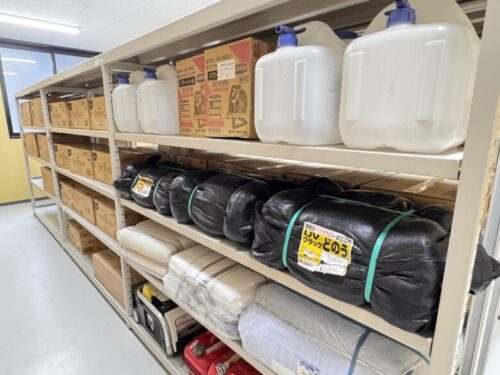 災害時に役立つ物資を収納した「坂本支所内の水防倉庫」。
