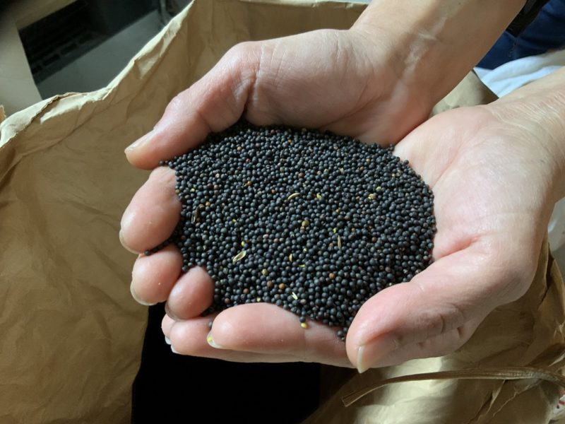 まず、見せてもらったのが、原材料の菜種(菜の花の種)。もっと柔らかい色してるのかと思ったら、結構黒々しています。胡麻みたい。