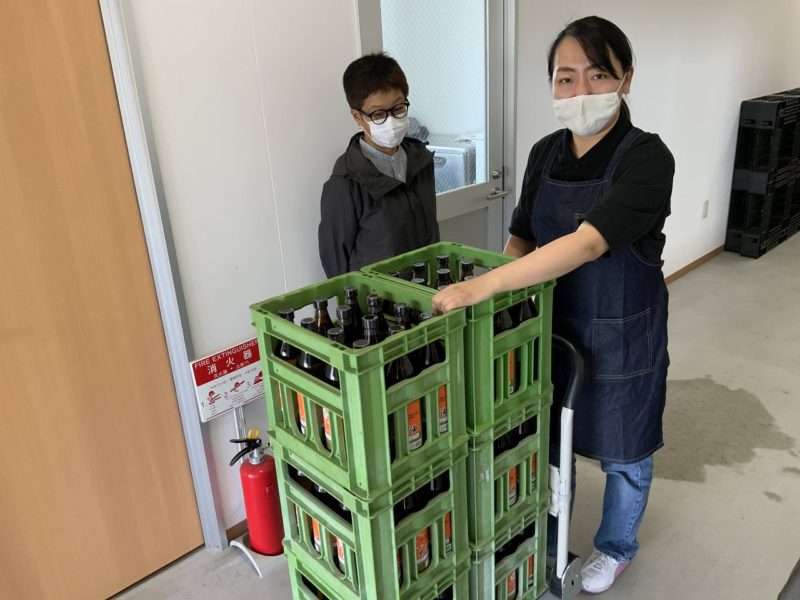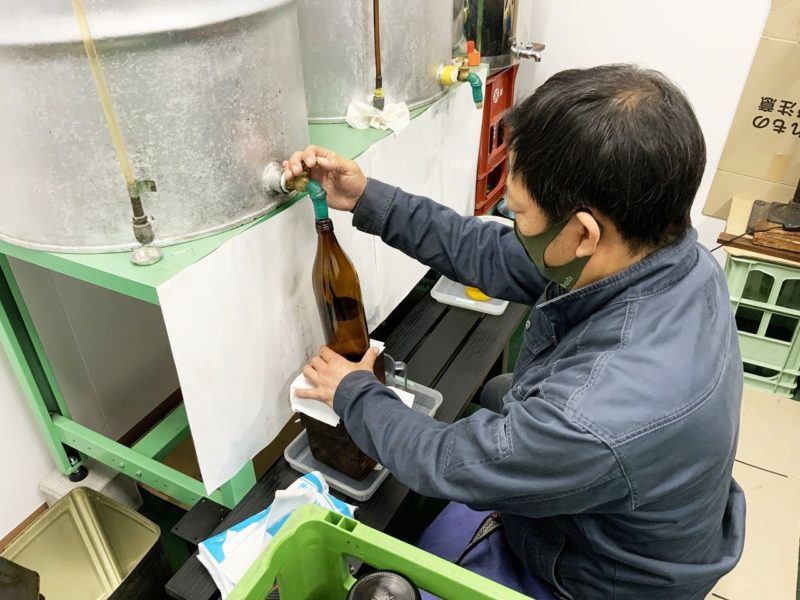 タンクからひとつひとつ手作業で社長自ら瓶詰めしていきます。最初から最後まで手作業で、創業当初から変わらないやり方です。