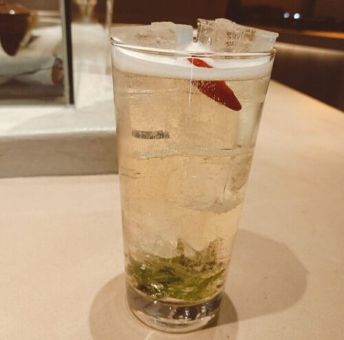 鷹の爪をつけこんだ焼酎のソーダ割なんですが、大葉を水草に、鷹の爪を金魚に見立てたドリンクです。