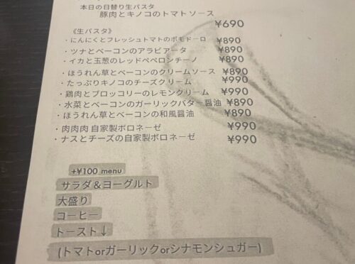 こんな街なかにあるお店なのに、生パスタが690円!?と信じられない気持ちで看板を見ていると、