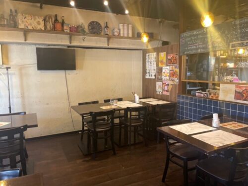 シックな店内にテーブル席が並んでいて、照明も優しく、あたたかい雰囲気。