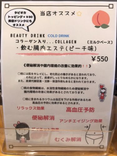 店内で飲めるドリンクも、コーヒーやハーブティー、ソフトドリンクのほか、コラーゲン入りのタピオカドリンクや、疲労回復やアンチエイジングなどに効果がある美容ドリンクもあって、ありがたい限り!ドリンクはテイクアウトも可能です。