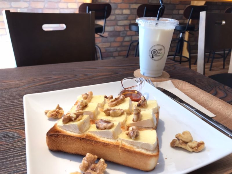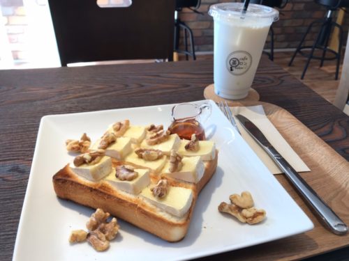 美容にも良いとされるくるみを使った、くるみとカマンベールトースト(メープル添え 税別650円)と、美容ドリンク(税別550円)の中から、飲む腸内エステ(ピーチ味)を頼んでみました。