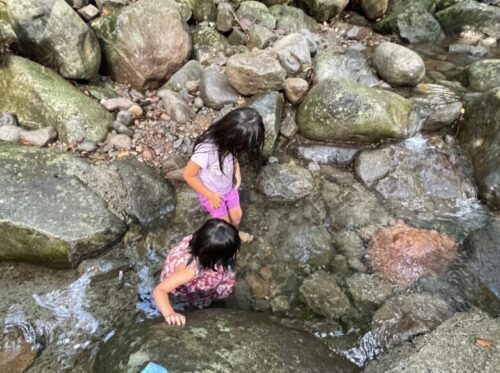 子どもたちも、少し手前の川で、たまらずに水遊び。