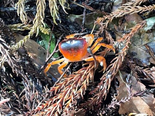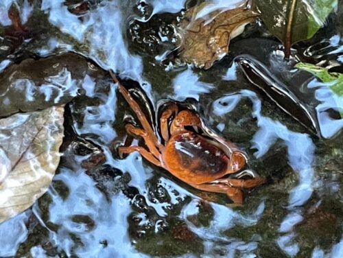車を降りて水源へと向かっていると、かわいいサワガニを発見!