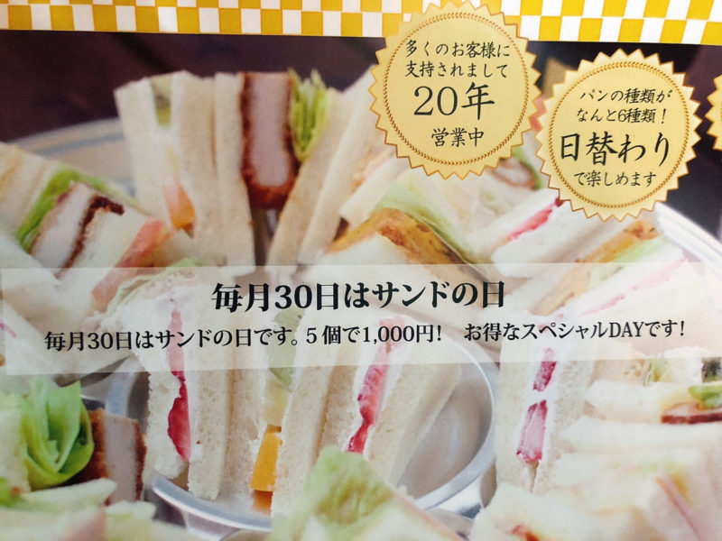 「サンド屋」では、毎月30日は、どのサンドイッチも5個で1000円とめちゃめちゃお得!これは行くしかない!