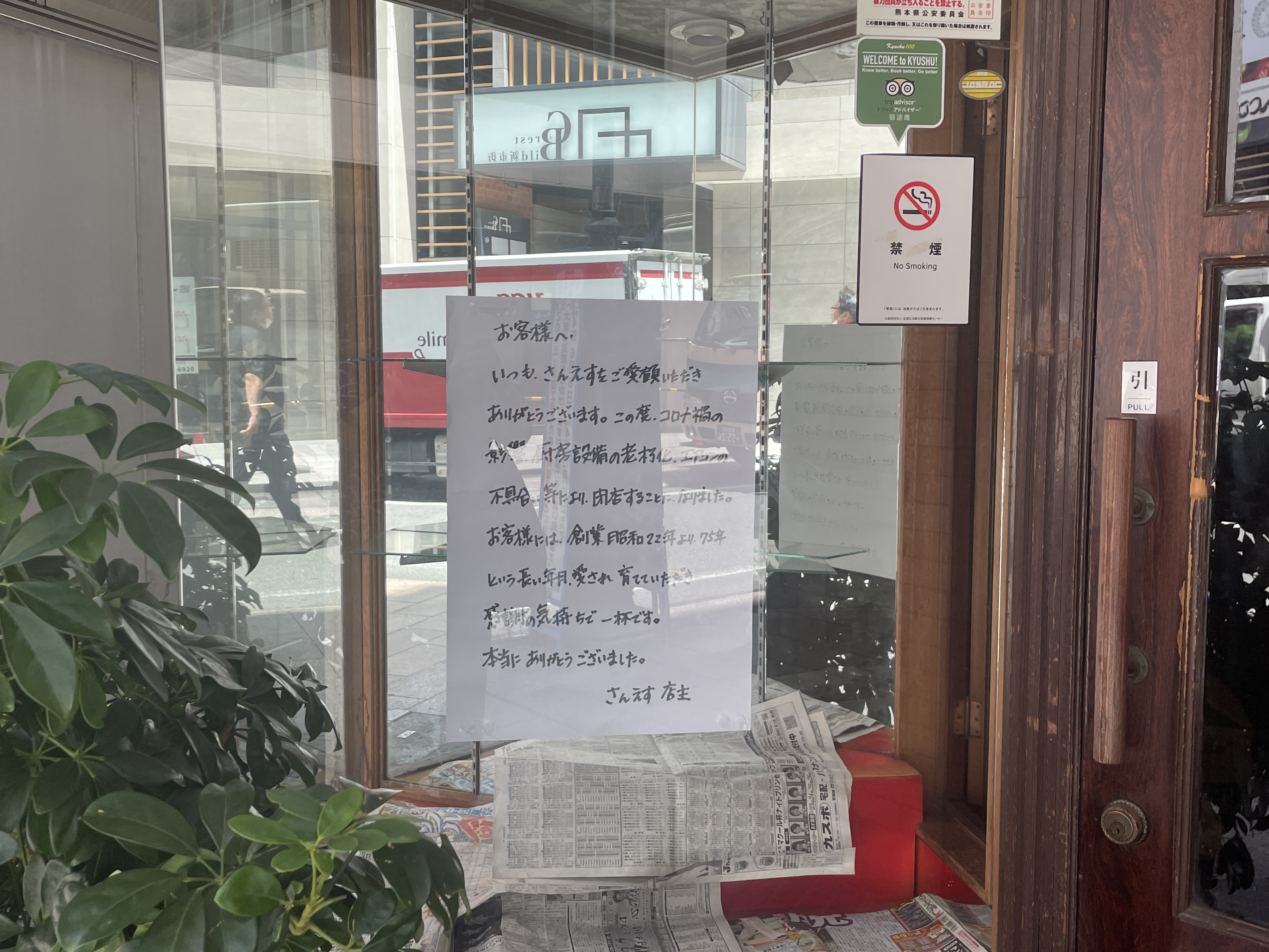 熊本市中央区の新市街アーケードから栄通り方面に曲がってすぐの場所にある老舗「さんえす」が2022年8月24日をもって閉店。