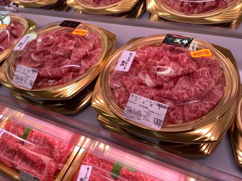 日替わりの目玉商品もお手頃。普段からあか牛が他より安く買えるお店ですが、さらに安くなっています。もうその辺のスーパーのアメリカ産とかと変わらない値段。