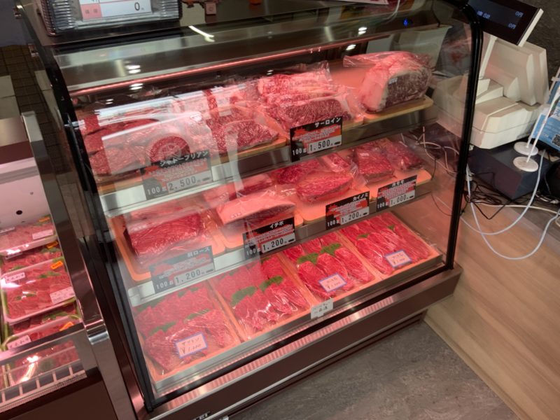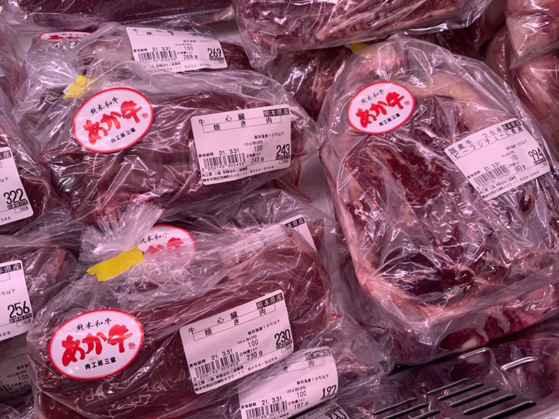 ケースにはみっちり、肉、肉、肉。県産牛はすべて自社で育てているあか牛。普通にスーパーで買う牛肉と同じくらいの金額であか牛が購入できます。