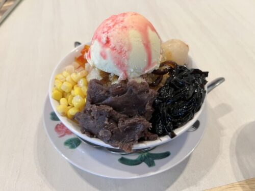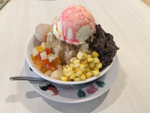 アイスカチャンとはマレー風かき氷のこと。日本では氷にシロップもしくはフルーツが一般的ですが、マレーシアではピーナッツやトウモロコシや小豆、黒豆、寒天などが入っているのだそう。