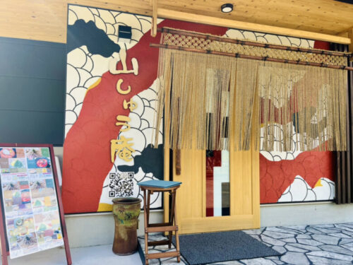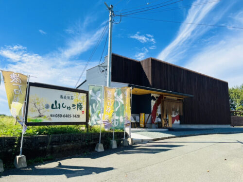 菊池神社や菊池公園付近から続く国道387号線沿いの山道をまっすぐ登っていくと、左側に「山しゅう庵(さんしゅうあん)」があります。「重味青空市場」がある広い敷地内です。