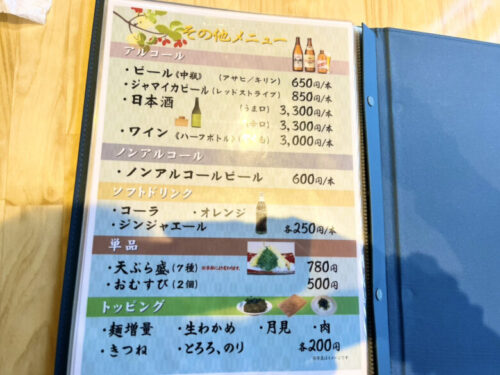 お昼のみの営業ですがお酒も注文できますよ。蕎麦はトッピング可能です。