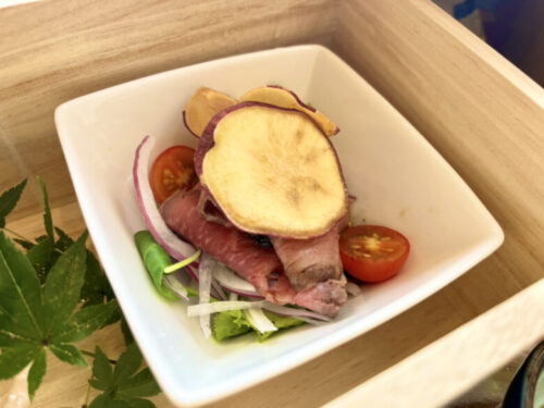 サツマイモチップスが入った「ローストビーフのサラダ」。お肉がものすごく柔らかくて美味しいです!