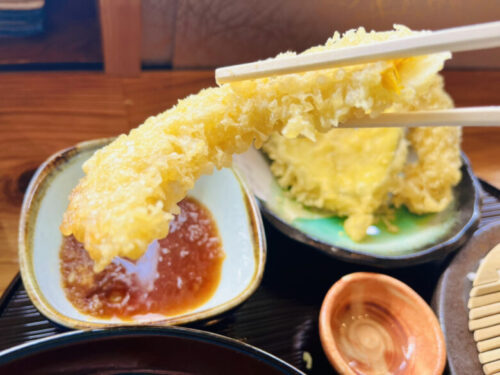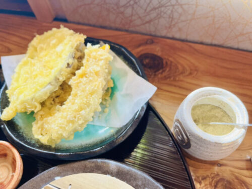 旬の食材を使用した「3種の天ぷら」はボリューム感たっぷり!この日は「かぼちゃ、茄子、まいたけ」の3種類でした。お箸で掴めないほど大きかったので、半分に割ってから食べるほど。ふんわりしながらもカリっとサクサク食感の衣と旬の食材が相性抜群!