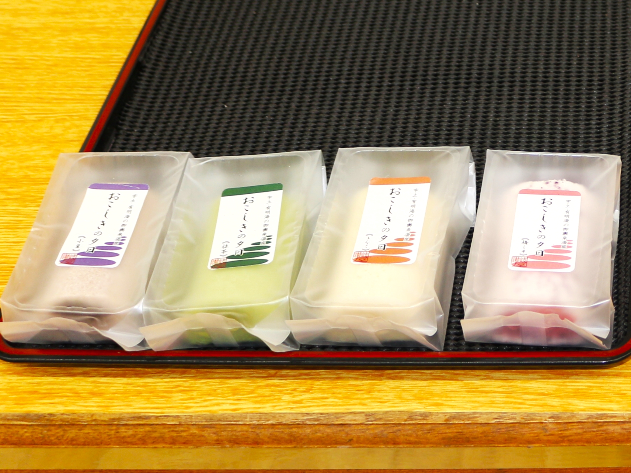 お店の方に聞いたおすすめのおこしきの夕日。伝統の本落雁粉を使用したお菓子で、餡入りのもの。こちらも色々な色があってとっても可愛い。ご年配の方にも喜ばれそうですね。
