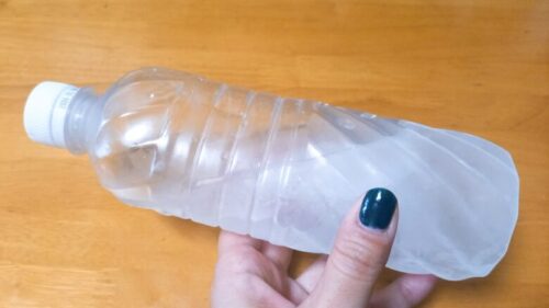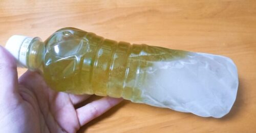 ①ペットボトルに半分の水を入れ、斜めにして凍らせる