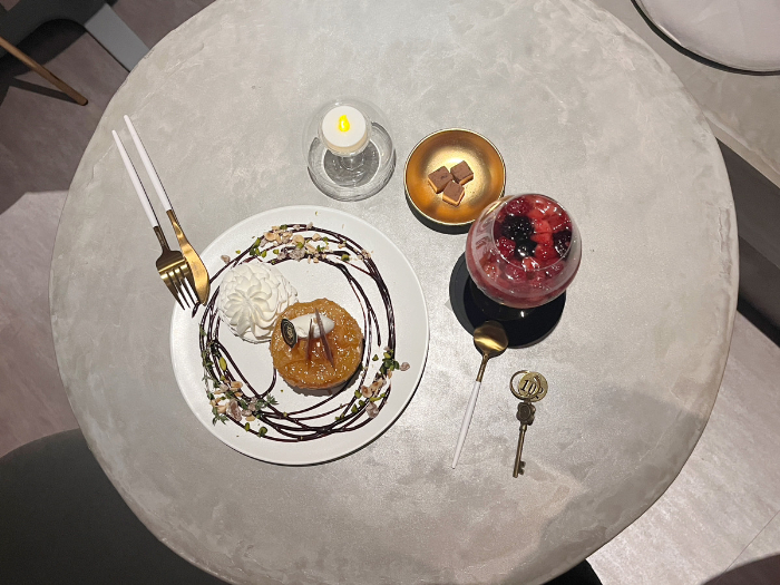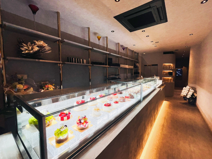 30種類のケーキを始め、マカロンやチョコレートが購入できる1階のテイクアウトフロアに、限定のケーキとアルコールメニュー(ソフトドリンクもあり)を楽しめる2階のイートインフロアがあります。