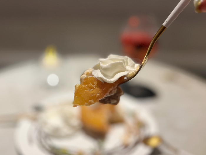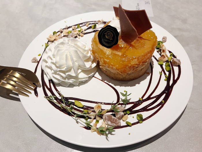 煮てあるりんごは、歯ごたえがしっかり残っていてフレッシュ。甘さも少なくてちょっと大人のケーキと言う感じです。その下のタルトはザクザクで、中はしっとりしていて甘みもしっかり。甘さや食感のバランスもとても良くて後引く美味しさです。