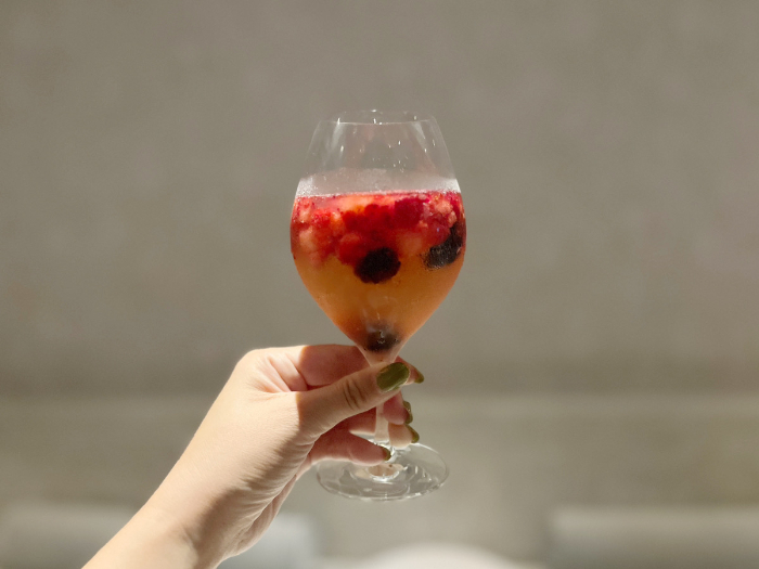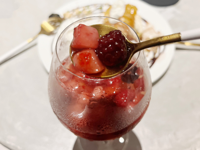 ゴロゴロ入ったフローズンフルーツはそのまま食べても、潰してワインと一緒に飲んでも。