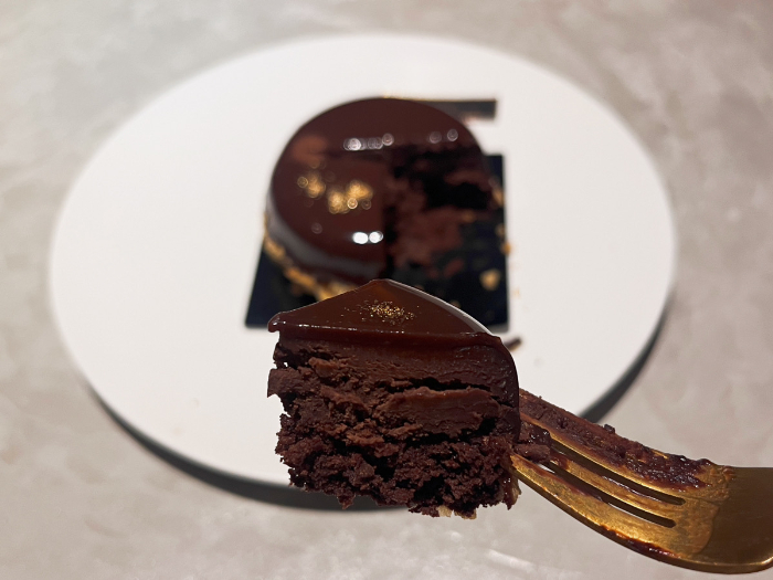 私はお店の方に聞いたおすすめのケーキを頂きました。チョコレート生地の上にチョコガナッシュ、その上からさらにチョコレートをコーティングしたチョコレートづくしの贅沢なケーキ!