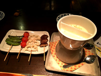 ささみ串と野菜のチーズフォンデュとレモンたっぷりサワーで、すっかり健康になった気分です!