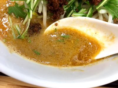 スープを底からレンゲですくって啜ると、胡麻の風味の後に魚介系の味が後から滲み出てくる感じで、このような感じは私の食べた今までの担々麺のスープにはなかった素晴らしい味!