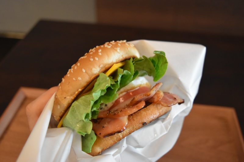 パティが見えないほどのたくさんのベーコンやレタスもぎっしり挟まれています! ずっしりと重みがありますが、女性1人でも食べ切れちゃいます。噛みごたえ抜群なので、食べている最中は無言になっちゃいます。カップルで来店された際はご注意を!