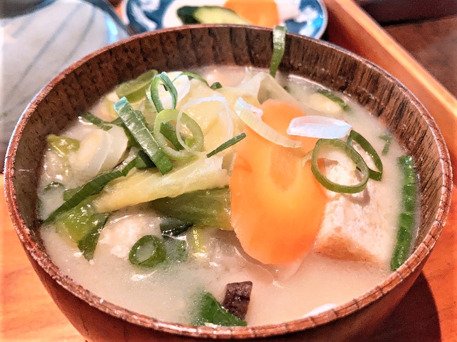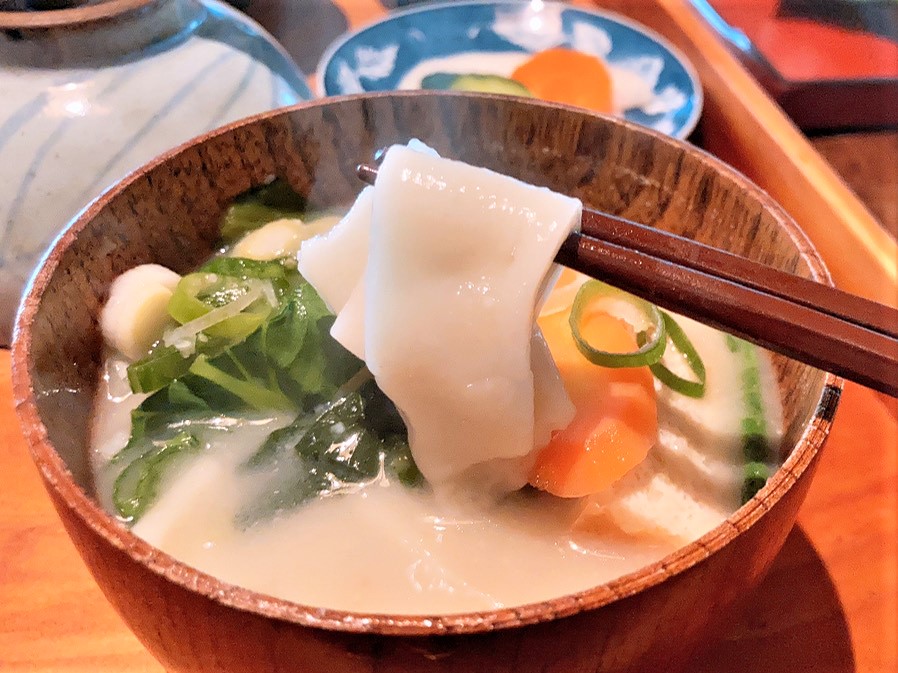 そしてお店の名物のだご汁。具沢山!自社開発されたオリジナルの味噌は、優しい甘さがありつつも深みを感じる味。農薬、化学肥料不使用の大豆・米・麦から作られている味噌です。めちゃくちゃ美味しい!毎日でも食べたいだご汁です。