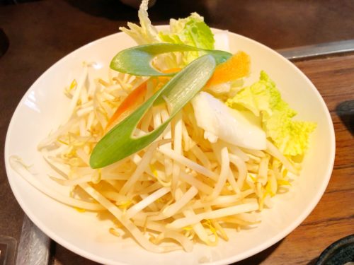 最初に野菜盛りとお肉、ごはんが出てきます。野菜はとにかくもやしがシャキシャキしていて美味しいです!野菜だっていくらでも食べられちゃいます!