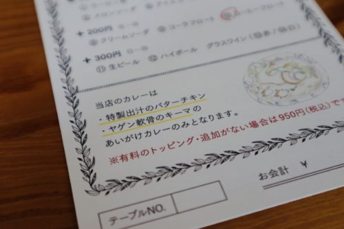 こちらのシートにご飯の量、辛さ、パクチー「あり」「なし」と「量」、うずらのウスターソース煮卵の「あり」「なし」と「量」を記入してオーダーします。