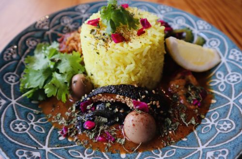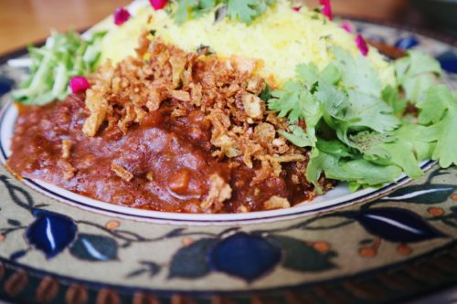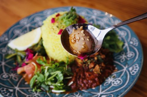 そしてカレー。私の注文、ご飯の量少なめ、辛さ普通、パクチー普通、うずらのウスターソース煮卵2個がこちら。