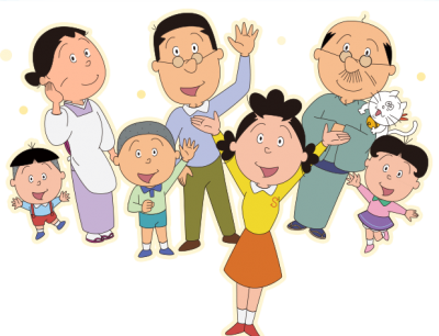 サザエさん、マスオさん、波平さん、フネさん、カツオ、ワカメ、タラちゃん