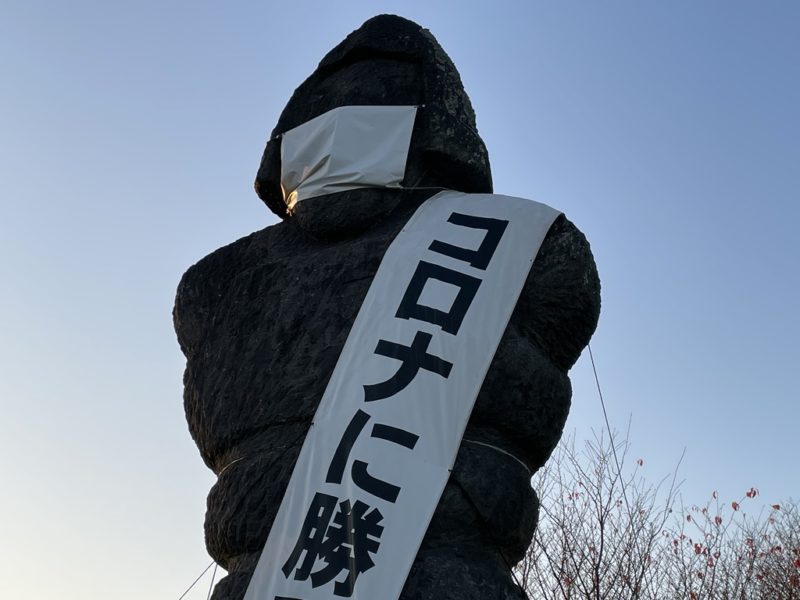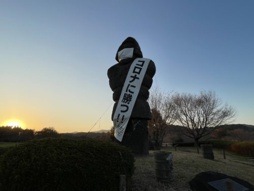 「コロナに勝つ!!」のたすきを肩にかけて、夕日に照らされています。この大きさ実際に見ると圧巻です。飛沫感染防止のためマスクも着用してます。