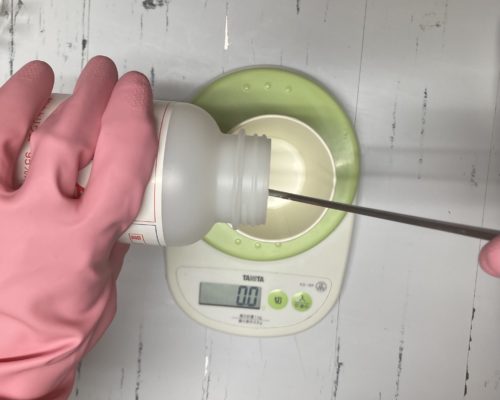 まずは、水と苛性ソーダ、油を量ります。苛性ソーダを扱う際は、強いアルカリ性のためゴム手袋やエプロンを付けます。