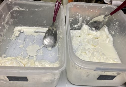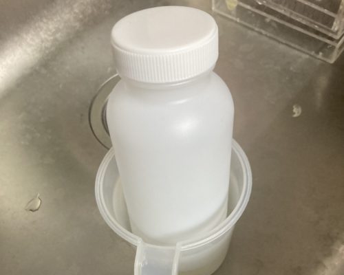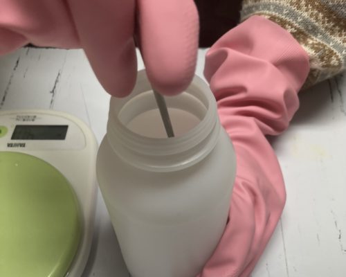 苛性ソーダと水を混ぜていきます。混ぜていくうちに温度が上がってきてびっくり!そのため、ステンレスチールやプラスチック容器を使います。