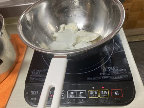次に、パーム油とココナッツオイルを量ります。安定して硬く、型崩れしない石けんにするために必要なオイルだそう。