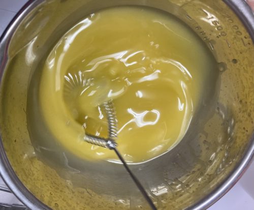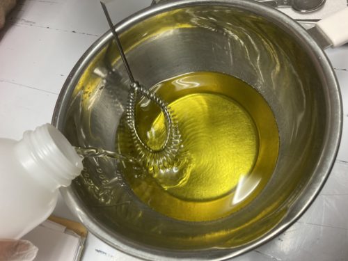 溶けたオイルは、40~45度くらいになるまで冷まし、冷ましておいた苛性ソーダと水を混ぜた液体を投入。混ぜていきます。