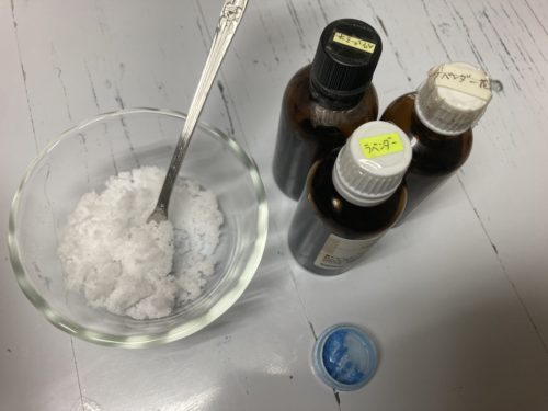 そんな中選んだ香りは、ラベンダーとペパーミント。塩の爽やかさを意識してこれらの香りを選びました。塩は、天草の塩。これらを入れていきます!出来上がりが楽しみになってきました。