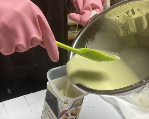 いよいよ混ぜ終わった生地を型に入れていきます。バラ型や円型など型の種類も様々。なめ子は、たくさん石けんを作りたかったので、牛乳パックで型取りをしました。