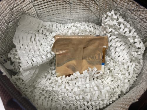 しっかりガムテープで口を塞ぎ、冷えないように紙を敷き詰めます。持ち帰って、1日保温バックで放置!