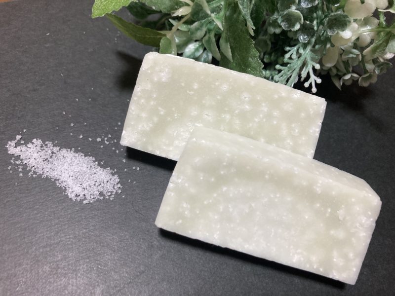 後日パックから取り出すと・・・おぉ、ちゃんと石けんになってる!塩の粒々が見えていい感じ。色は色粉を少なく入れすぎたのか青!って感じにはならなかったけど、この色も爽やかさがあってまた良い。これを、ソープカッターで切ると綺麗に切れるそうなのですが、なめ子は持ち合わせておらず、ナイフで切りましたよ。綺麗に切れるか不安だという方は、持ち帰らずにお店へ預けて、切ってもらったのを郵送してもらうといいですよ。